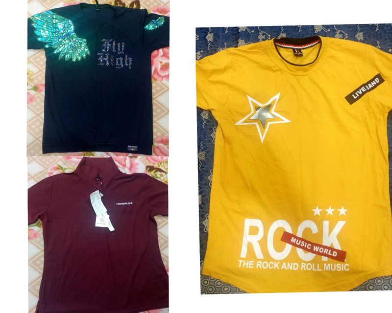 A bundle of three stylish men's t-shirts. Includes a black graphic tee with a 'Fly High' design, a yellow rock music themed t-shirt, and a maroon Herbalife polo. Great for casual wear or as a gift.