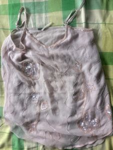 This is a Tank top, not worn even once, in an excellent condition. ( only a little problem with laces which is not at all noticable and that is the reason iam selling it at a really low cost) The fabric is synthetic Georgette with bead work on it.