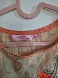 This is a very beautiful piece with simple orange coloured flower work complimenting the cream colour with beautiful sleeves.