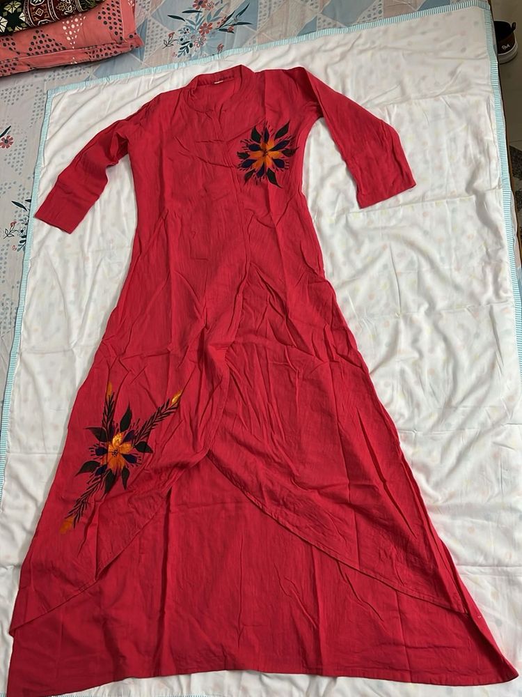 Coral colour , 3/4th Sleeves gown style cotton kurta with artistic prints and unique style from Nayo. Very comfortable soft cotton fabric perfect for Hot weather cities , also thick enough to feel comfortable in office AC. Good for office and daily casual wear.