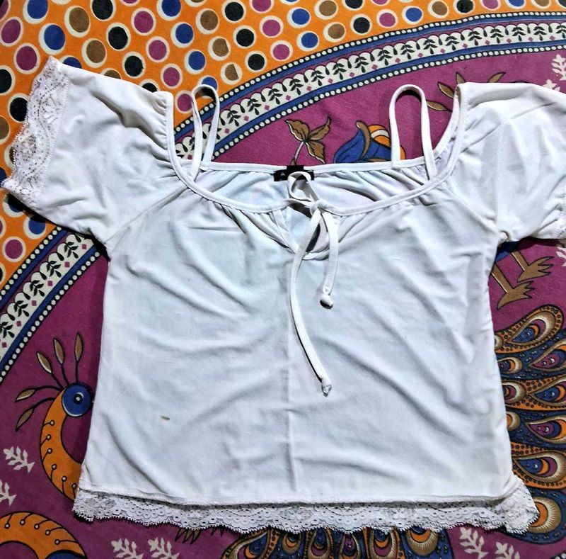 a white crop top with short sleeves and a lace trim at the bottom and sleeves. It has a square neckline with thin straps and a drawstring tie in the center.