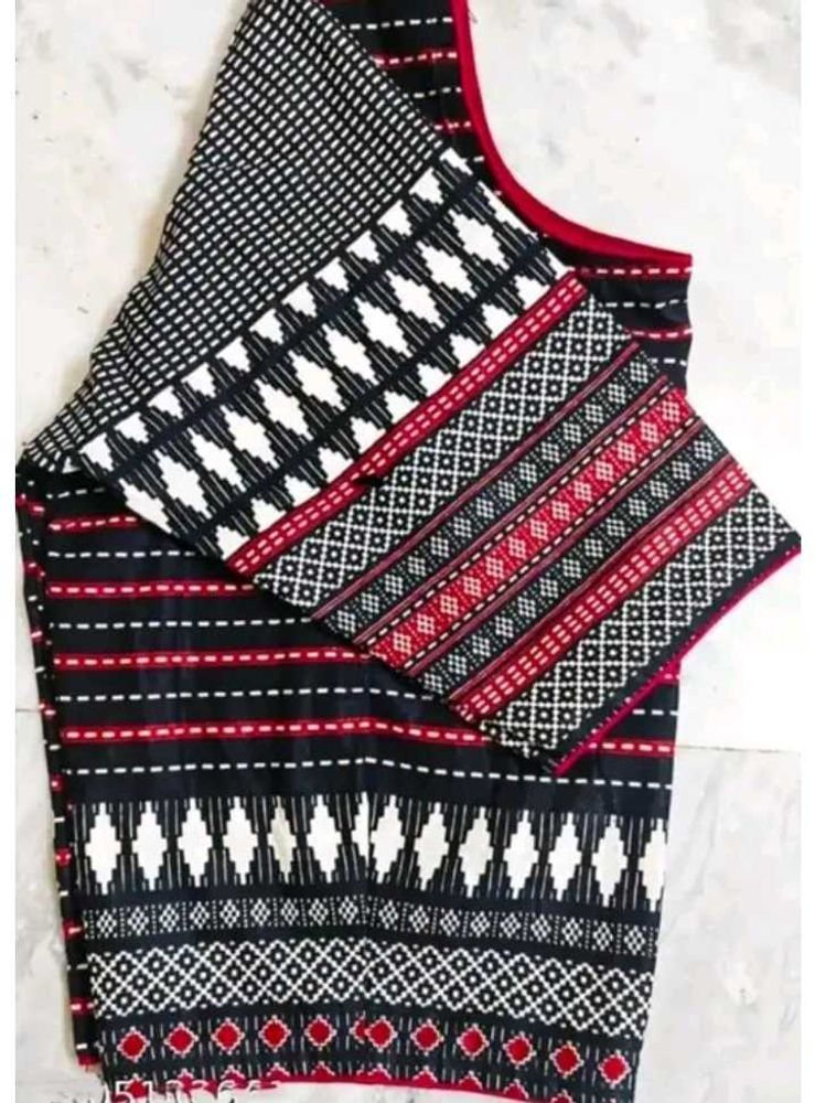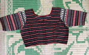 This blouse (with maroon piping) has a bold dolby print which gives a woven or embroidered look. (Note: It is not embroidered)