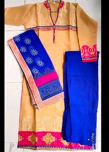 Beige And Blue Kurta Set With Duptta