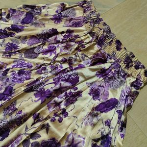 This is a beautiful ankle-length skirt with a beige base and vibrant purple floral prints. The fabric is soft and slightly glossy, giving it a smooth and elegant look. It has a comfortable elastic waistband and flowy pleats, perfect for casual outings or semi-formal occasions.