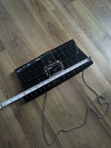 Elevate your evening look with this chic black clutch. Features a faux crocodile embossed texture, a silver-tone buckle detail, and a delicate chain strap for easy carrying. Perfect for parties or a night out!