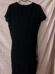 Trendy black t-shirt dress with a bold graphic print. Perfect for casual outings or a stylish everyday look. Comfortable and easy to wear, this dress is a versatile addition to your wardrobe. Pair with sneakers or sandals for a complete outfit.