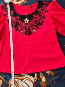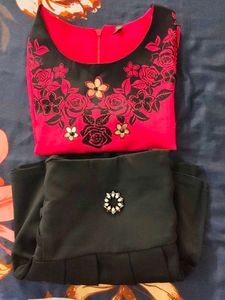 Cute black pleated skirt with decorative criss-cross side details and a sparkly embellishment. Carrot colour Top with black colour flower design and golden touch to give party look.