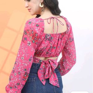 This cute pink crop top features a beautiful floral print and long sleeves. Perfect for a casual day out or a fun night with friends. Pair it with jeans or a skirt for a stylish look! Worn once, in excellent condition.