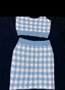 Cute two-piece set featuring a cropped top and matching skirt in a trendy blue gingham pattern. Perfect for a casual day out or a fun summer event. The set is in good condition and ready for a new home. Add a touch of playful style to your wardrobe with this adorable ensemble!