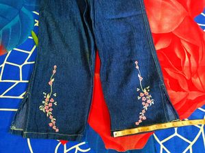 Denim wide leg jeans with floral embroidery in lower portion๐.Back side has also beautiful floral work.It has total 4 pockets.