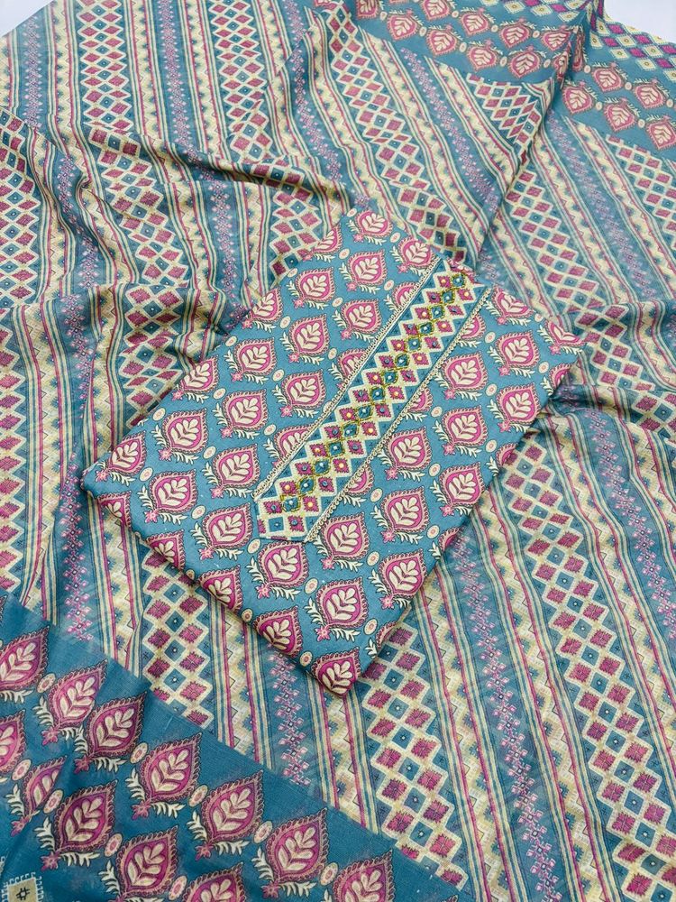 Beautiful fabric featuring a unique blend of stripes and botanical leaf-like prints in blue and pink. Perfect for creating custom clothing or home decor items. The fabric has a soft texture and a vibrant color palette. Ideal for adding a touch of bohemian flair to your next sewing project.