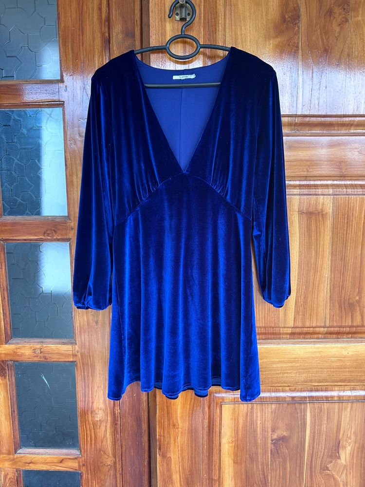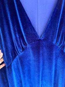 shoulder 17” bust 18” waist 15”, elastic so when fully stretched 17” hips 22” length 32” sleeves 21” electric blue color, perfect to shine in this dress for a party .. suits all skin tone. worn just once for a wedding party . if you are shy to wear short dress can wear it with a legging or with tights and boots