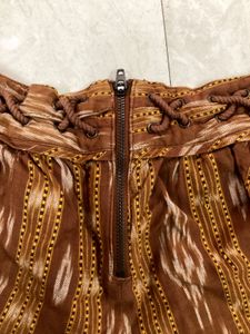 These unique boho shorts feature a brown ikat-inspired pattern, a braided waistband detail, and interesting cutouts on the sides. They have a relaxed fit and are perfect for a casual summer day or festival outfit. Size mentioned