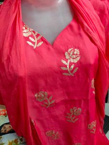 Elegant red Salwar Kameez with delicate gold floral print. This three-piece set includes a long tunic top, loose-fitting pants, and a matching dupatta. Perfect for festive occasions and cultural celebrations. A timeless addition to your ethnic wardrobe.