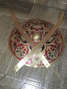 This is made up of pure brass and it is old kept as Showpiece at my home. This Sword and Dhaal is made by Rajasthani Handicrafts. I have bought it from Jaipur Rajasthan and the actual price is Rs. 5000/- and I want to sell t for half price. It has some stains because it was kept aside for long time.