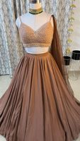 Elegant brown lehenga choli with beautiful embroidery. Perfect for weddings, parties, and festive occasions. The set includes a stylish choli, a flowing lehenga skirt, and a matching dupatta. Make a statement with this beautiful ethnic ensemble. Suitable for festive and party wear.