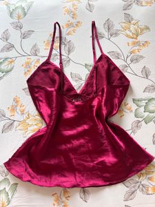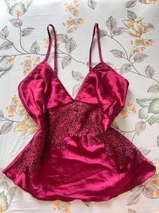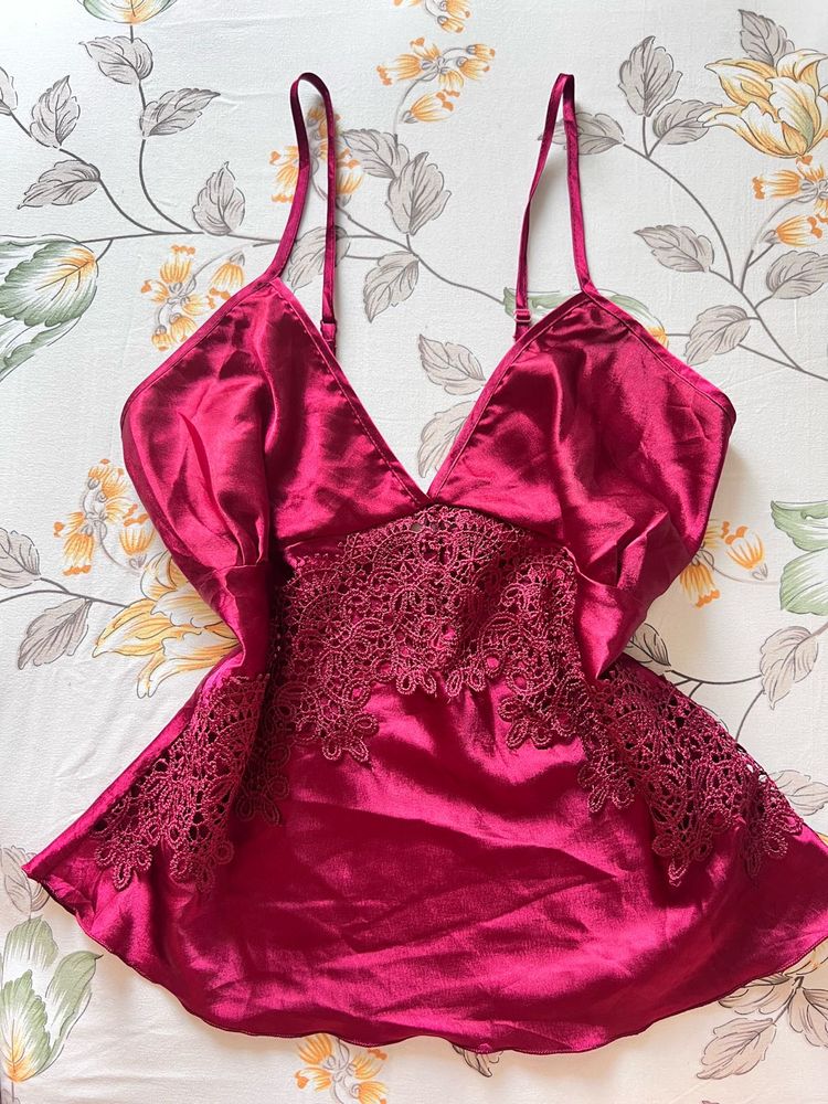 Elegant burgundy camisole with delicate lace detailing. Perfect for a night out or a cozy night in. Comfortable and stylish, this piece adds a touch of sophistication to any outfit. The rich color and intricate lace make it a standout item. size - S to M