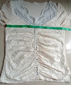 -WHITE TOP HAS LITTLE PINK STAIN PRESENT IN SOME AREAS BUT LOOKS LIKE IT'S OWN DESIGN