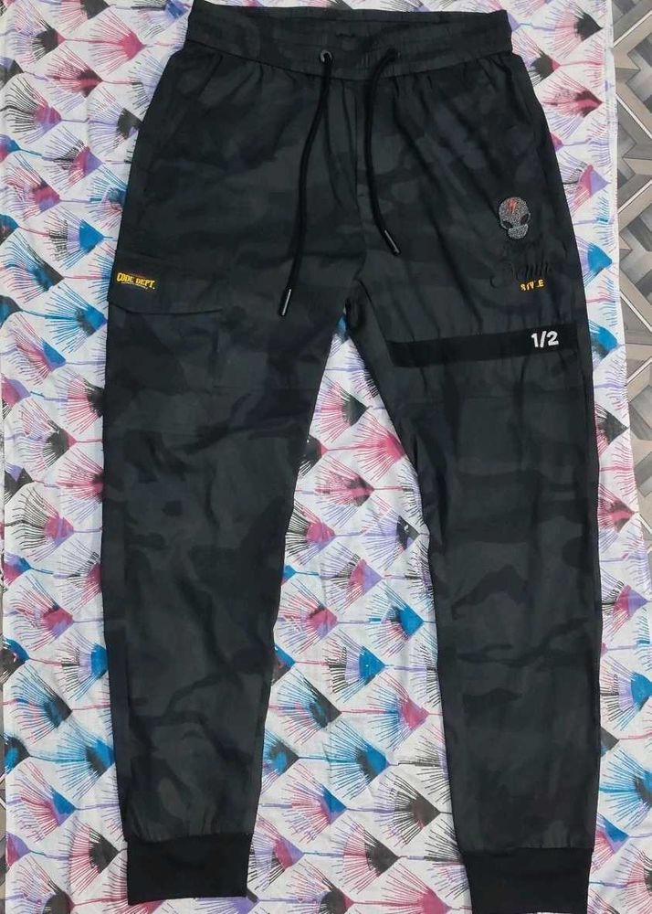 Cool camo print cargo pants with unique graphic details. These lightweight pants feature a comfortable drawstring waist and cuffed ankles for a modern fit. Perfect for casual wear or streetwear styles. Add a touch of edge to your wardrobe with these statement cargo pants.