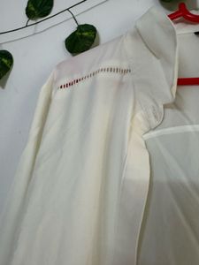 This off-white shirt features delicate cutwork detailing on the shoulders, adding a subtle touch of elegance to its clean, classic design. Crafted from comfortable, breathable fabric, it’s perfect for both casual outings and office wear. With its versatile style and refined accents, this shirt seamlessly blends everyday ease with polished sophistication.