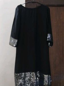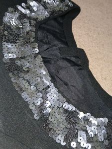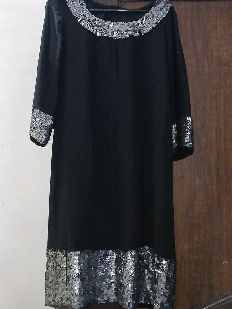 Elevate your wardrobe with this chic black dress. Featuring stylish embellishments around the neck, sleeves, and hem, this dress is perfect for a night out or a special occasion. Pair with heels for a sophisticated look.