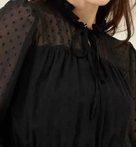 This sophisticated black midi dress features a delicate polka dot pattern on sheer chiffon fabric. It has a flattering cinched waist, long sleeves, and a ruffled hem. Perfect for a special occasion or a night out! Its elegant design makes it suitable for various events, easy to dress up or down with accessories.