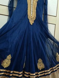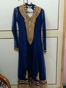 Stunning blue tunic featuring intricate gold embroidery and pearl-like button detailing. Perfect for special occasions or adding a touch of elegance to your wardrobe. Long sleeves with mesh overlay. Size is not marked, please see photos for best estimate.