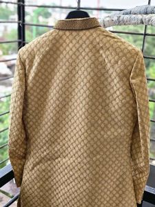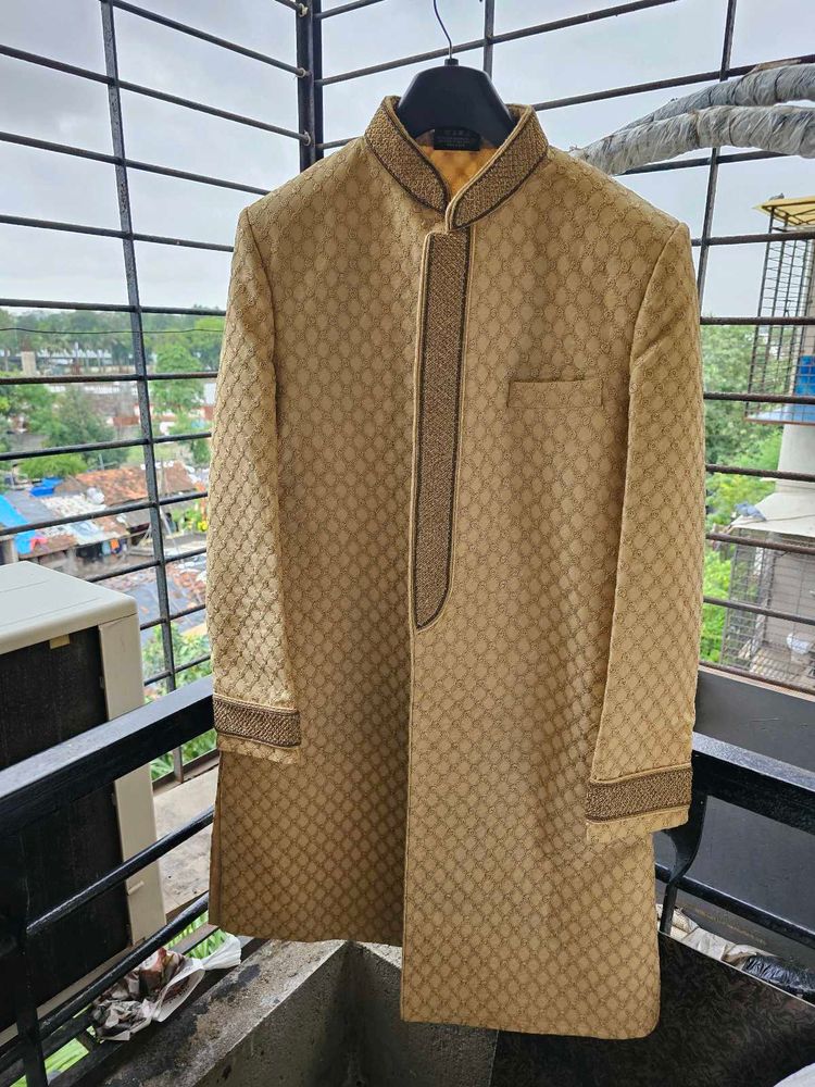 Stunning gold sherwani with intricate woven detailing. Perfect for weddings, festive occasions, or cultural events. Features a mandarin collar and classic silhouette. This timeless piece is sure to make a statement. The subtle pattern adds a touch of sophistication. Excellent condition, gently used.