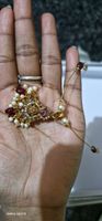 This is a beautiful gold tone necklace with lovely red and pearl colored accents. It's perfect for dressing up any outfit and adding a touch of sparkle. The necklace has a unique pendant and delicate chain. Would make a great addition to your jewelry collection or a thoughtful gift!