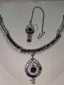 This is a 3 piece set which includes earrings, necklace, and a head piece. All pieces have a beautiful jewel drop design with sparkling rhinestones and dark red accents. Great for dressing up for a special event!