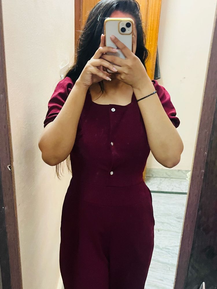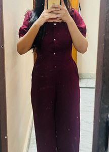 Stylish maroon jumpsuit in soft, breathable fabric. Features puff sleeves, a fitted waist .Perfect for parties, casual outings, or dinner dates. Gives a classy, flattering look. • Size: M (fits S-M comfortably) •A bit Stretchable and comfy material • Worn once, in excellent condition • Not transparent, soft on skin • No damages or marks