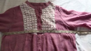used few times. A small stain on right side This beautiful mauve top features delicate lace embellishments around the neckline. It's perfect for a casual day out or a relaxed evening. The comfortable fabric and flattering cut make it a versatile addition to your wardrobe. Pair with jeans or a skirt for an effortlessly chic look.