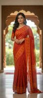 This beautiful red saree features a unique print, perfect for festive occasions or a special event. The lightweight fabric drapes elegantly and the intricate detailing adds a touch of sophistication. A timeless piece to elevate your wardrobe. Style it with statement jewelry to complete the look. Perfect for weddings, parties, or any special occasion. The saree is in good condition.
