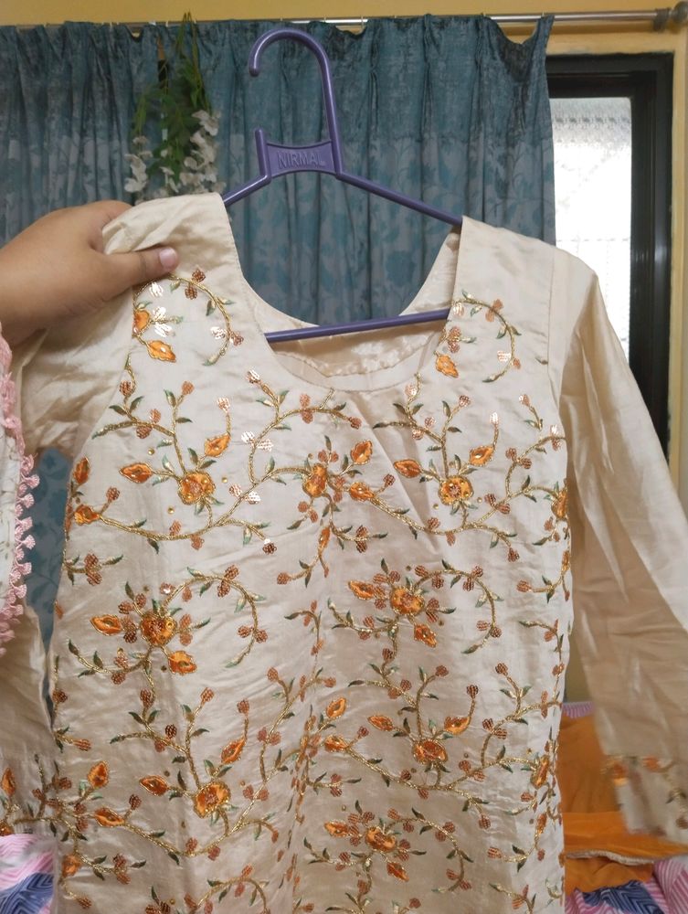 I bought the dress material from the famous market in Mumbai, got it stiched for myself! wore it only twice! the kurta is heavy with nice embroidery! the lace of embroidery is given in duppatta as well! the bottom is in the pant form with Canvas at the end and 3 buttons as visible in the picture! I burnt a back of the lace of duppatta slightly as it can be seen in the picture, it doesn't show up! the dress is as good as new! perfect for someone who likes heavy dresses! it's in the shade of cream and orangy mango soft of colour!