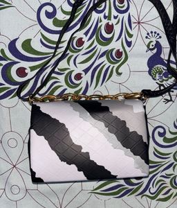 its a pretty multicolour slingbag with black, grey and white colours on it along with the trendy gold chain.