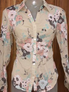 This vintage-inspired button-down shirt features a delicate floral print. Perfect for adding a touch of spring to any outfit, this shirt can be dressed up or down. It's in great condition and ready for a new home. Lightweight and comfortable, it's ideal for layering or wearing on its own.