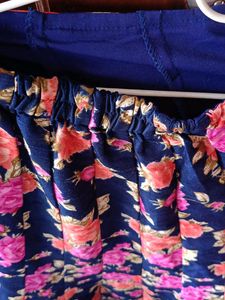 Elegant navy blue maxi skirt with a beautiful floral print. Perfect for a special occasion or dressing up your everyday look. Features a comfortable fit and a flattering silhouette. The golden trim adds a touch of sophistication. Excellent condition. Size: Unknown, please see measurements in photos.