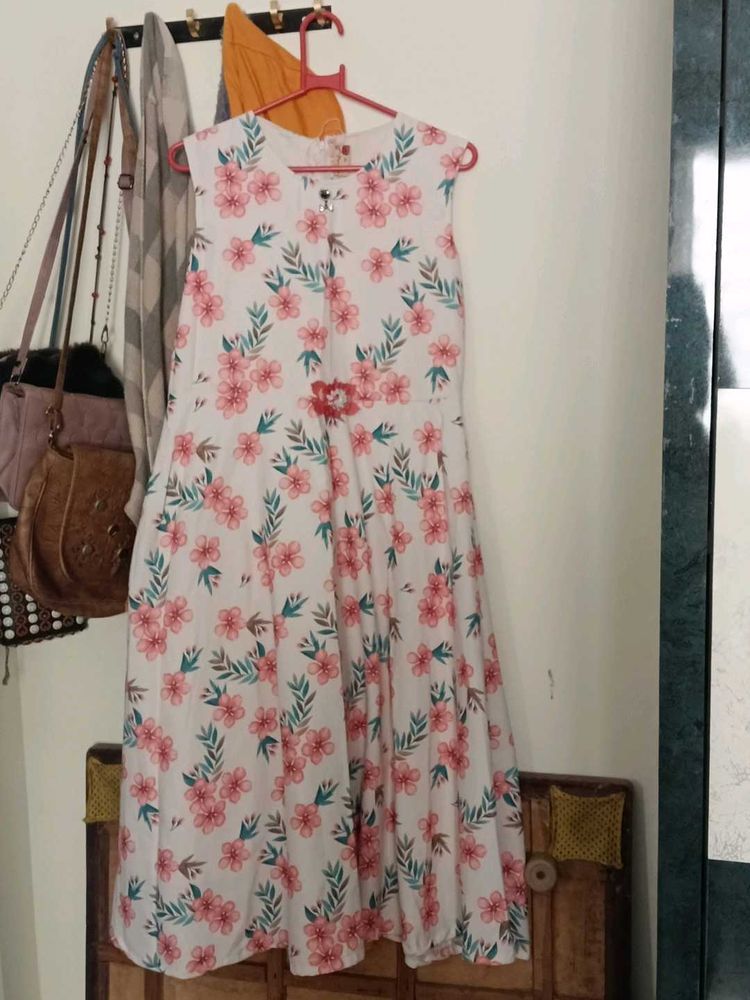 Charming floral midi dress in a lightweight fabric. Features a sleeveless design, delicate pink flowers with green leaves, and a flattering fit-and-flare silhouette. Perfect for casual outings or summer events.