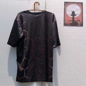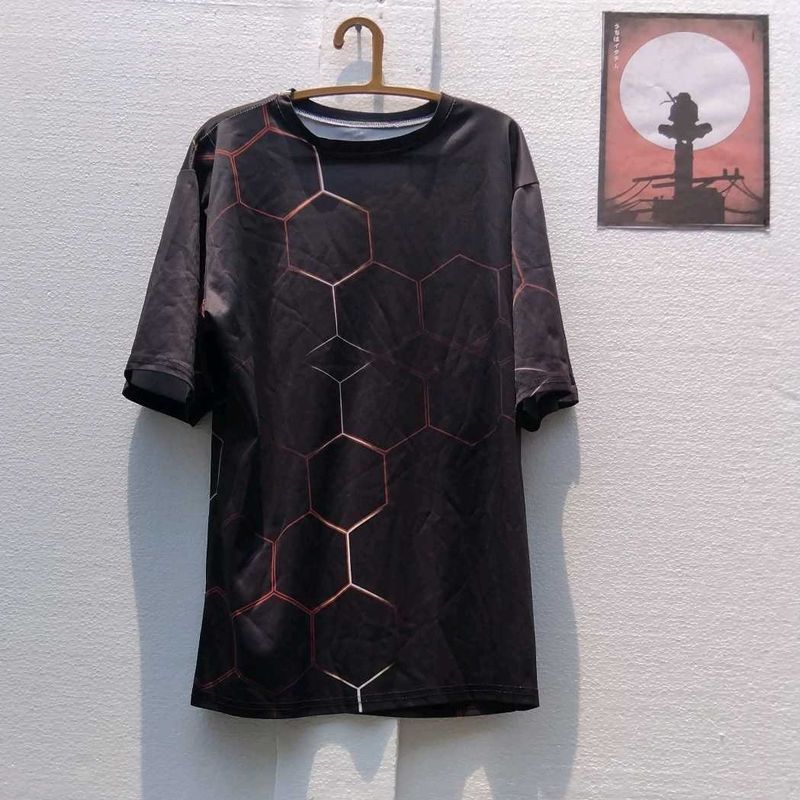 Dark colored t-shirt with a modern geometric hexagon pattern. Comfortable fit, perfect for casual wear or workout sessions. High-quality print ensures the design stays vibrant wash after wash. Lightweight and breathable. Size M.