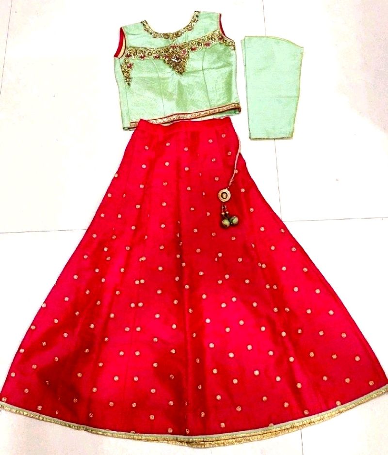 Beautiful girls' lehenga choli set, perfect for parties or special occasions. Features a red skirt with gold detailing and a light green blouse with ornate embroidery. Includes a matching dupatta. Great condition.