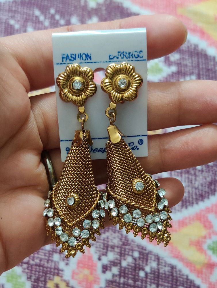 With a rare net design and silver stones, these golden earrings are sure to complement your festive or wedding wear. They come with 1 plastic stopper on each earring.
