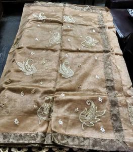 Beautiful, lightweight chanderi silk fabric with intricate embroidery and bead embellishments. Perfect for creating unique dresses, sarees, or other elegant garments. The fabric has a subtle sheen and a delicate drape, adding a touch of luxury to any design.