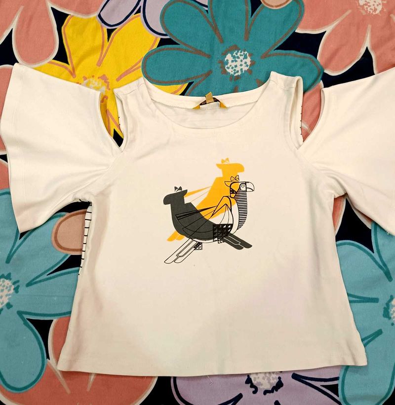 White tee with unique graphic print. Cold shoulder cut and flared sleeves for a trendy look. Perfect for casual wear. Fun and stylish addition to any wardrobe.