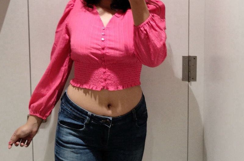 cropped hot pink long-sleeve top with button-up front. Perfect for casual outings or dressing up. The lightweight fabric ensures comfort and the flattering cut makes it a versatile addition to any wardrobe. Great condition.