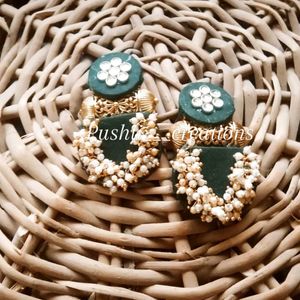 Elegant green and gold earrings featuring intricate beadwork. These unique earrings are perfect for adding a touch of sophistication to any outfit. Lightweight and comfortable for all-day wear. Perfect for party.