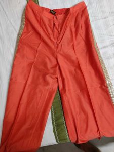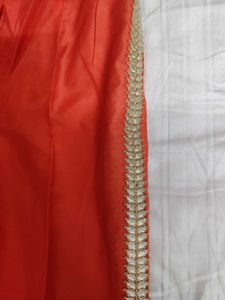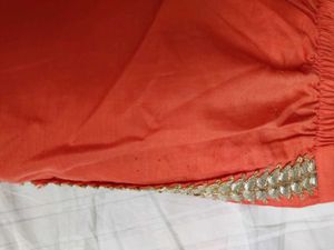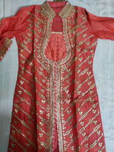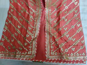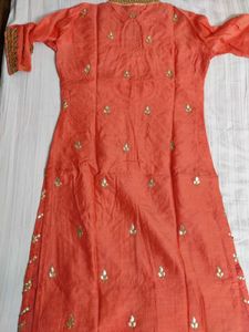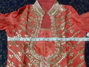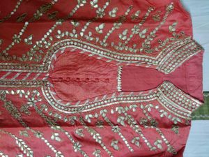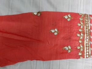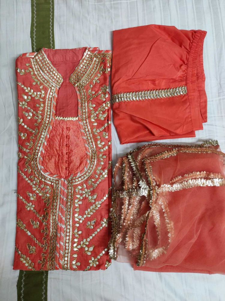 Heavy gotta patti full suit , kurti , palazzo pant and duppata in silk like fabric Has full gotta work all over and has bit of margins The palazzo has minor pilling on the upper area have added photo but it won't be visible as kurta will come over it Duppata also has gotta border