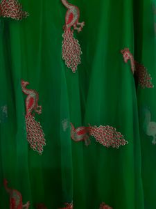 This green skirt is stitched at the near shop and likely new. i wear this at one time,because it is too lengthy than my length.it's can adjust waist by wrapper. length of skirt: 103cm type: umbrella stitched skirt colour: green skirt design: red and golden peacock design occasion:ethnic, party,and festiv wear material: net