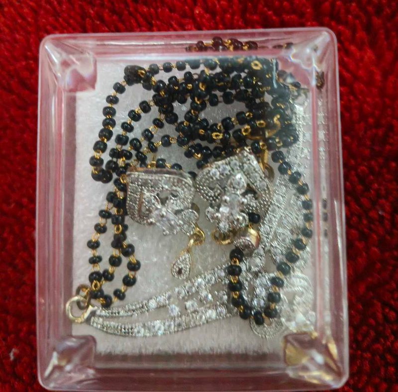 Beautiful Indian jewellery set including a mangalsutra and earrings. All pieces are adorned with sparkling stones and black beads. Perfect for a special occasion or to add a touch of elegance to any outfit. No coins ❌❌❌ Grab it fast 🤟🏻✅ Any query please comment ❤️