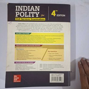 * Indian Polity by M Lakshmikant, 4th edition * On Indian policies and constitution * It is an old edition. * Bestseller for civil service aspirants. Great for academician, researchers and general readers