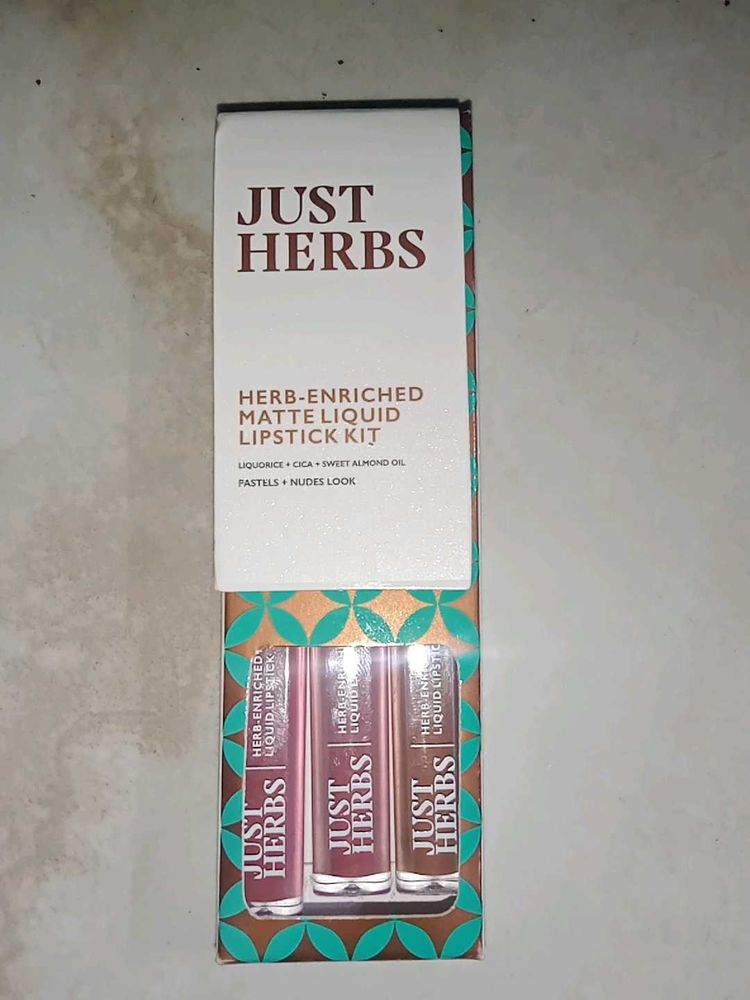 Brand new Just Herbs Herb-Enriched Matte Liquid Lipstick Kit. Includes three beautiful pastel and nude shades enriched with liquorice, cica, and sweet almond oil for a comfortable, long-lasting matte finish. Perfect for creating a natural, everyday look.